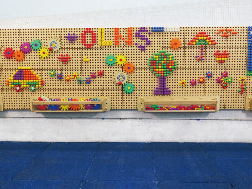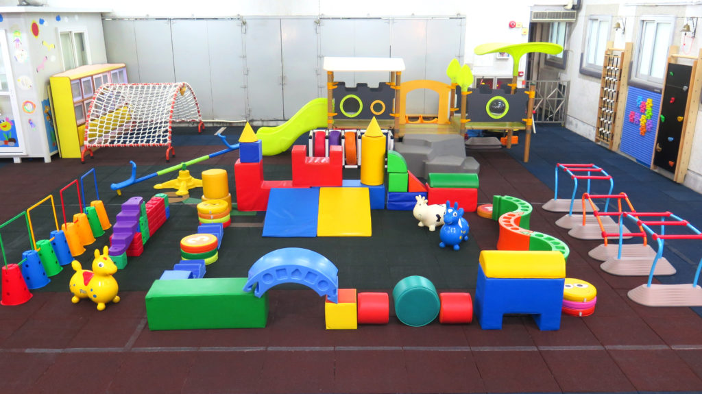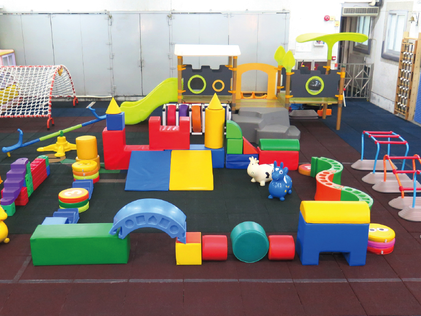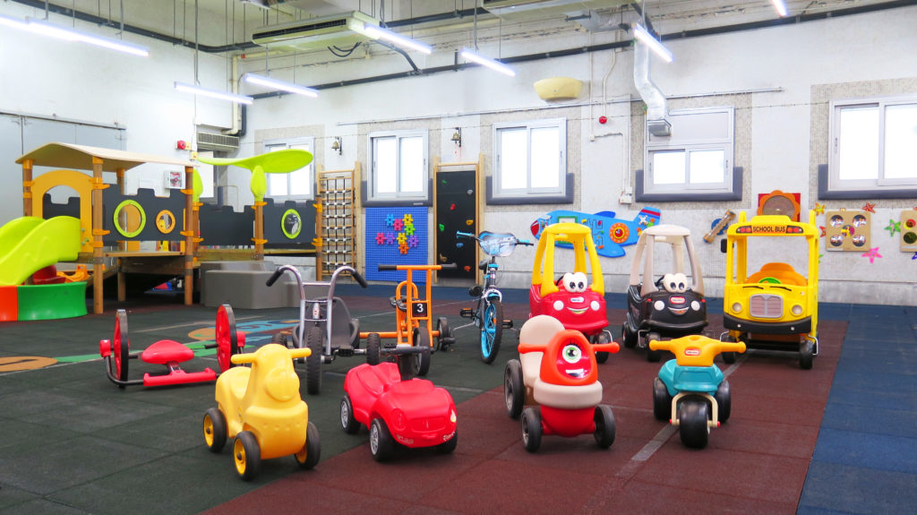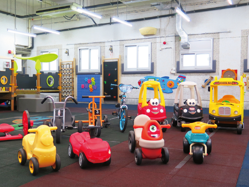 專屬室內大肌肉場地空間廣闊,鋪設安全軟墊,設有大型戶外體能器材如繩網、隧道、滑梯,並有建構及藝術創作區等,讓學生在遊戲中鍛鍊身體協調,空間思維和創意想像。