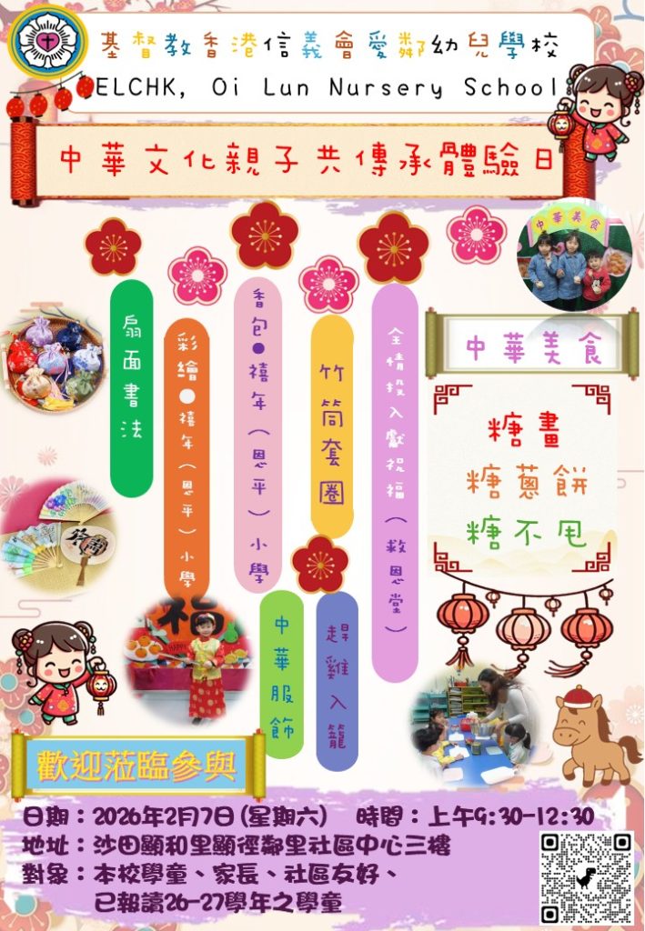 2026年2月7日(星期六),我們將舉行「中華文化體驗活動日—中華文化親子共傳」。